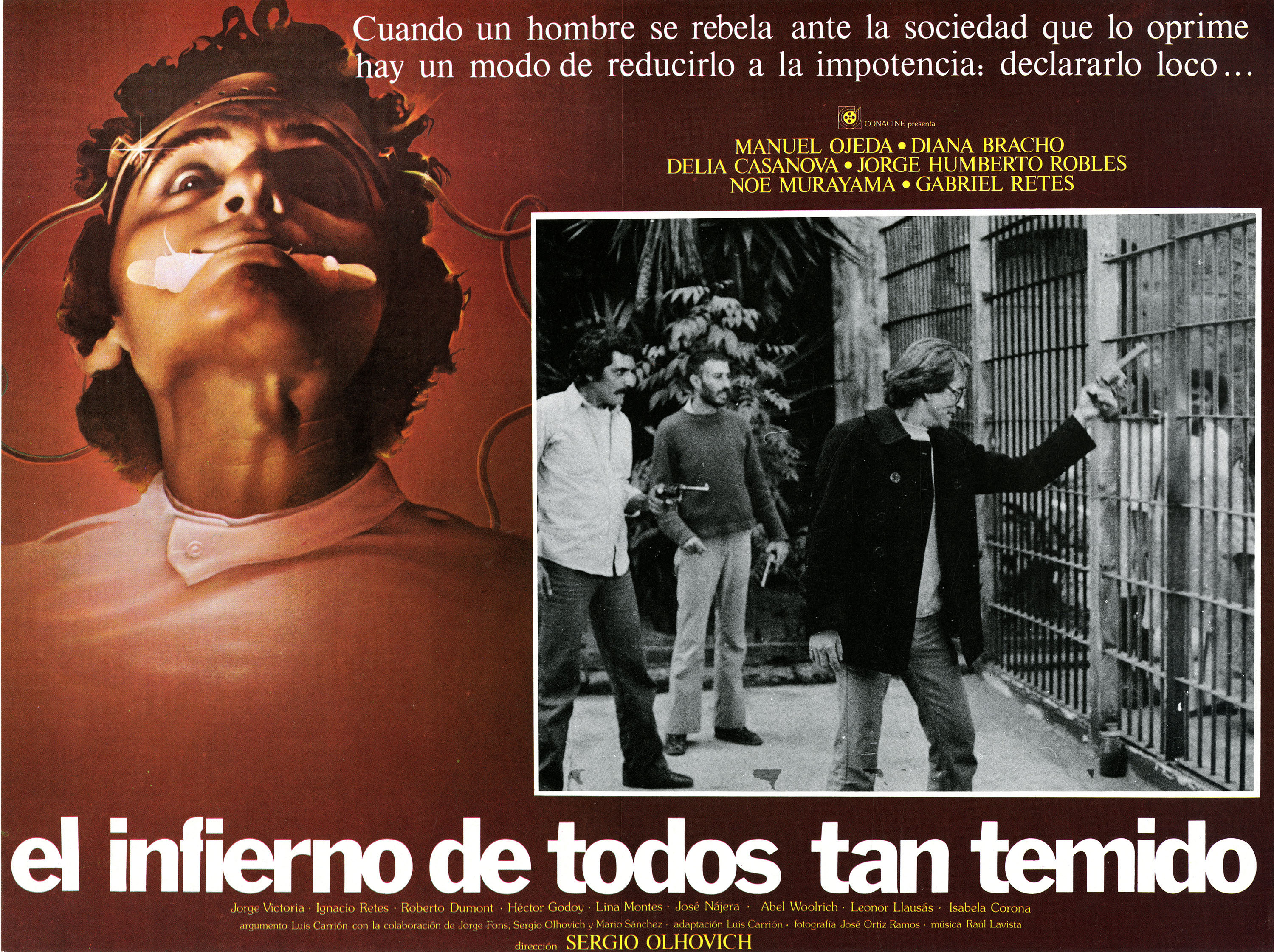 El lunes 31, en el canal 14.1 de televisión, pude ver la magnífica película El infierno de todos tan temido (1979), dirigida por Sergio Olhovich y basada en el libro homónimo de Luis Carrión. Producida por Conacine –en una época trascendental para el cine mexicano, que fue protagonizada por Manuel Ojeda. El filme se empezó a rodar en enero de 1979 en los Estudios Churubusco y en el Hospital Psiquiátrico de Tlalpan, pero se estrenó hasta el 10 de septiembre de 1981, lo que me lleva a pensar que fue “enlatada” un tiempo debido a la aguda crítica a las instituciones psiquiátricas y su uso represivo en relación a posiciones políticas, sobre todo después del movimiento de 1968.