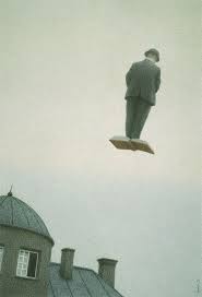 Aquí tenemos a un señor que sobrevuela el tejado de un edificio. En el edificio hay una ventana abierta, parcialmente abierta, pero nada nos permite pensar que el caballero volador ha salido por esa ventana, que no viene de más lejos, que no lleva hecho ya un largo trayecto. El señor que nos ocupa tiene debajo de los pies una cosa que parece un libro; tal vez lo sea o tal vez sea un aparato volador en forma de libro, hoy en día se inventan tantas cosas… Si verdaderamente es un libro, puede tratarse de un libro volador, compartir esta propiedad con las alfombras voladoras. Pero no hay que excluir que sea el señor quien esté capacitado para volar, y que en esta ocasión, inadvertidamente, un libro se le pegó a las suelas de los zapatos poco antes del despegue.