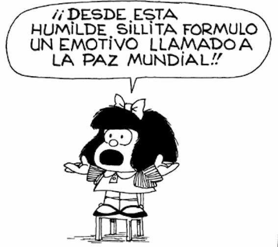 Porque Mafalda es defensora de la paz, como también del medio ambiente; está contra el armamentismo y en favor de la tolerancia. Aspira a ser intérprete de las Naciones Unidas, lugar propicio para convocar a la armonía y, por qué no, lograrla.
