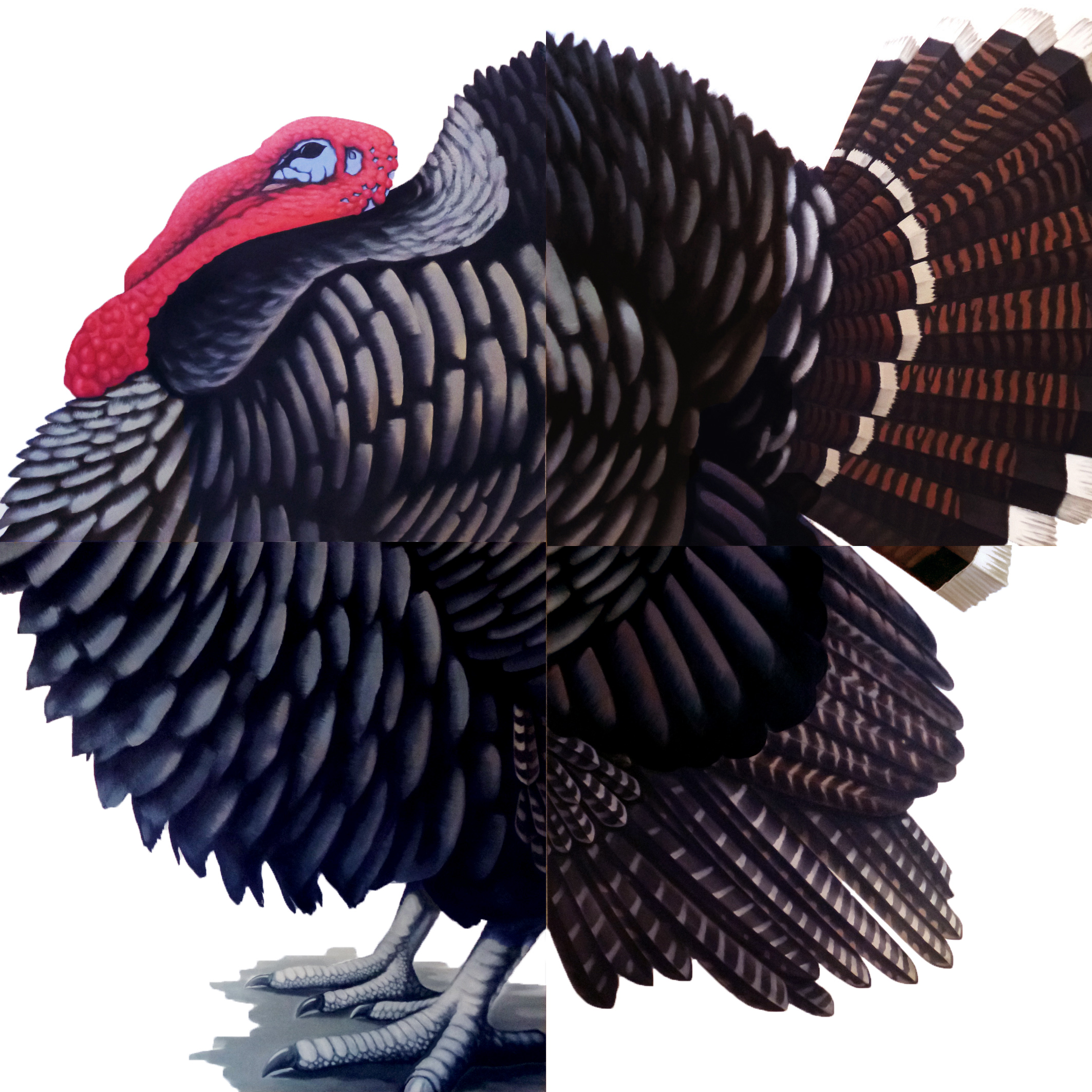En pintura, cuadro de gran formato interpretando la plasticidad propia —plasticidad fenomenal— del aspecto de un animal doméstico que a los ojos del extranjero descubridor resultó un ser fabuloso: Pavo doméstico exhibiéndose en cortejo, Temple sobre tela en cuatro bastidores de 130 x 130 cms, formando un políptico de 260 x 260 cms totales.