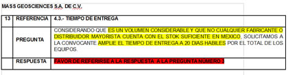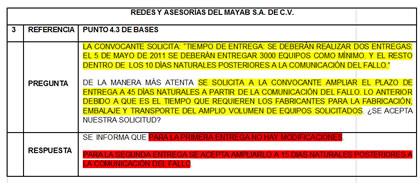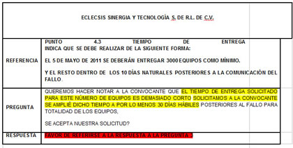 Por si esto fuera poco, hubo reiteradas quejas de los concursantes ante los reducidos tiempos de entrega. El argumento de todos los inconformes fue el mismo: dados los tiempos de fabricación, era imposible entregar 3,000 equipos en 10 días naturales. Sin embargo, las peticiones de ampliar este plazo fueron reiteradamente ignoradas.