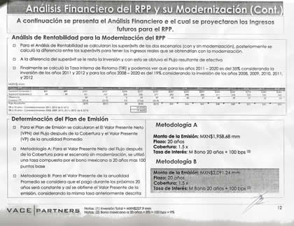 Para la bursatilización de los ingresos futuros del RPP, Vace Partners ha formulado dos propuestas: la primera, para un escenario sin modernización, plantea la emisión de 1 mil 958 millones de pesos a una tasa compuesta por el bono mexicano a 20 años más 100 puntos base; y la segunda, para un escenario con modernización, proyecta la emisión de 2 mil 91 millones de pesos, considerando la misma tasa.