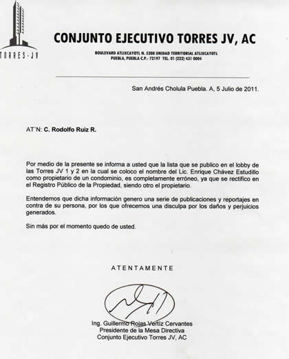 En la relación de condóminos morosos de las Torres JV de la avenida Atlixcáyotl hay un nombre que llama la atención, no sólo por la cantidad que adeuda por concepto de cuotas de mantenimiento y vigilancia, sino porque figura en la lista de propietarios de piso de esas lujosas oficinas.